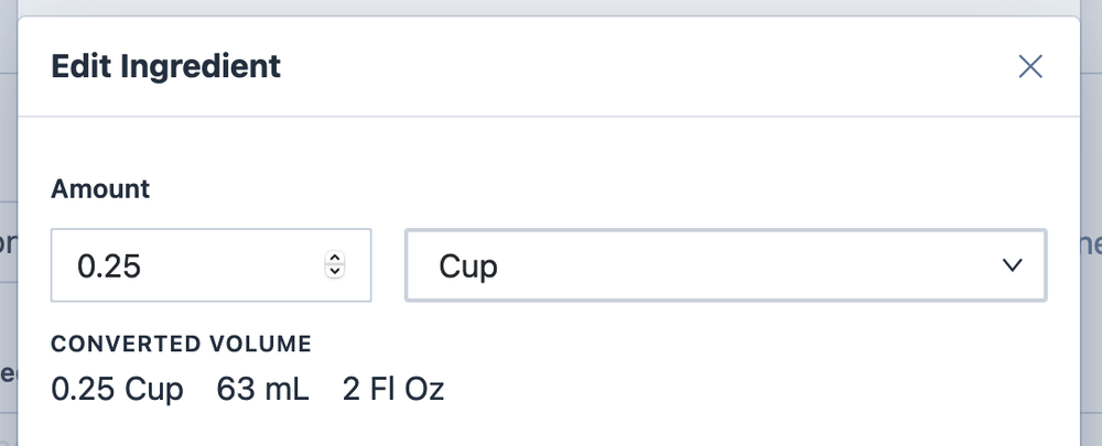 Every ingredient will weigh a different amount per volume. So our ingredients have a "Grams Per 1 Cup" field, which can then be used to work out g