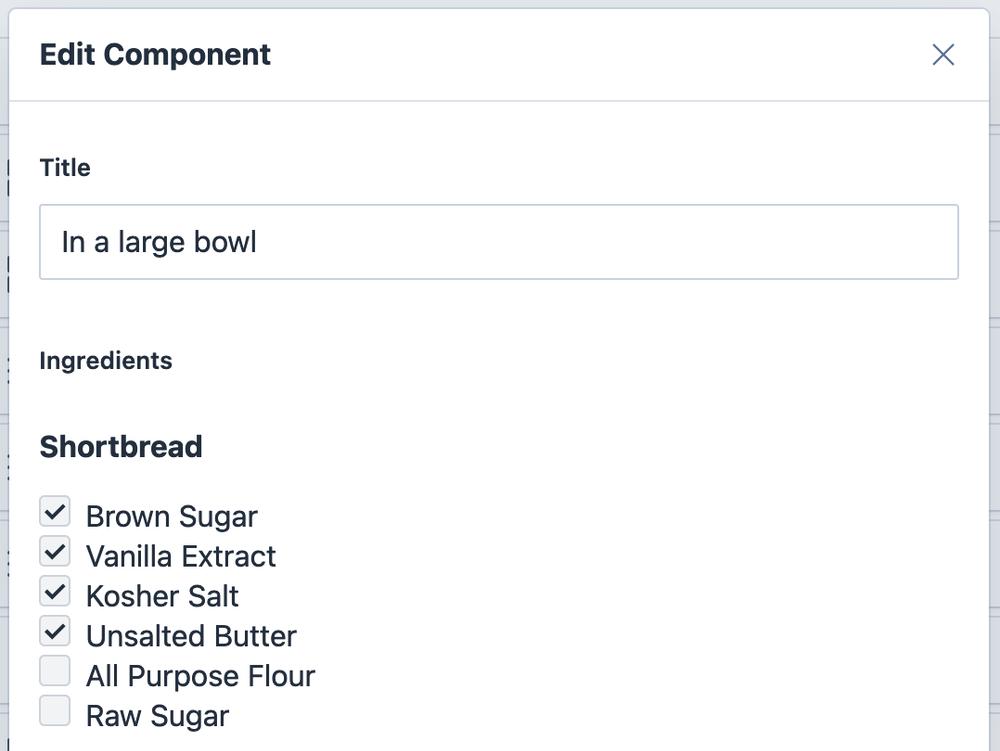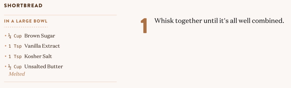 So, here we've broken up method steps that introduce each ingredient as "Components". A self-contained step in the method which references the required ingredients for that step, along with their amounts, with an instruction of what to do with them.