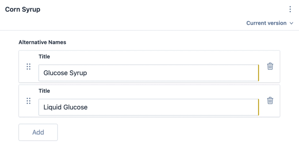 For example, many American dessert recipes call for Corn Syrup. With our structured content we can assign a list of alternative names to any ingredient.